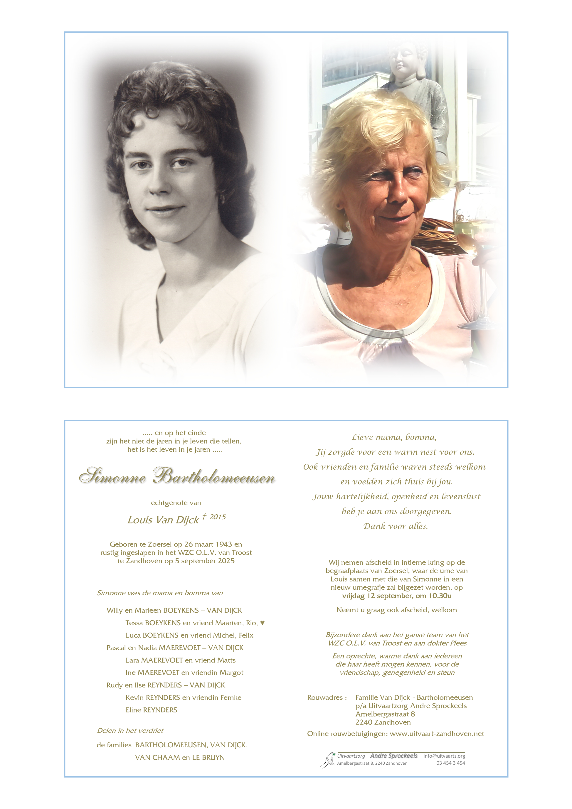 Overleden te Zandhoven (2240) op vrijdag 5 september 2025 op 82-jarige leeftijd
