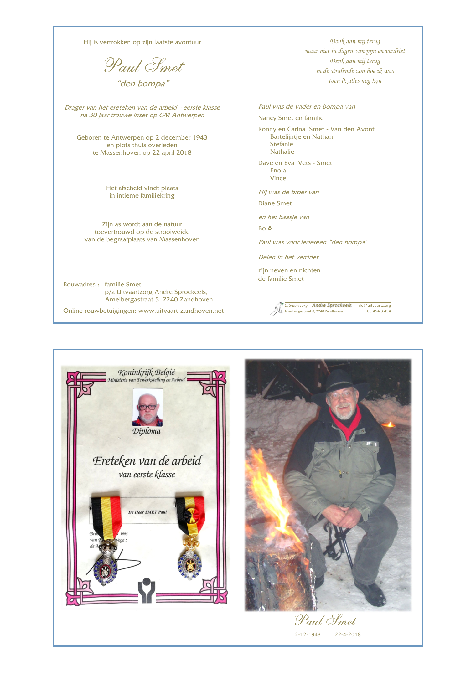 Overleden te Massenhoven (2240) op zondag 22 april 2018 op 74-jarige leeftijd